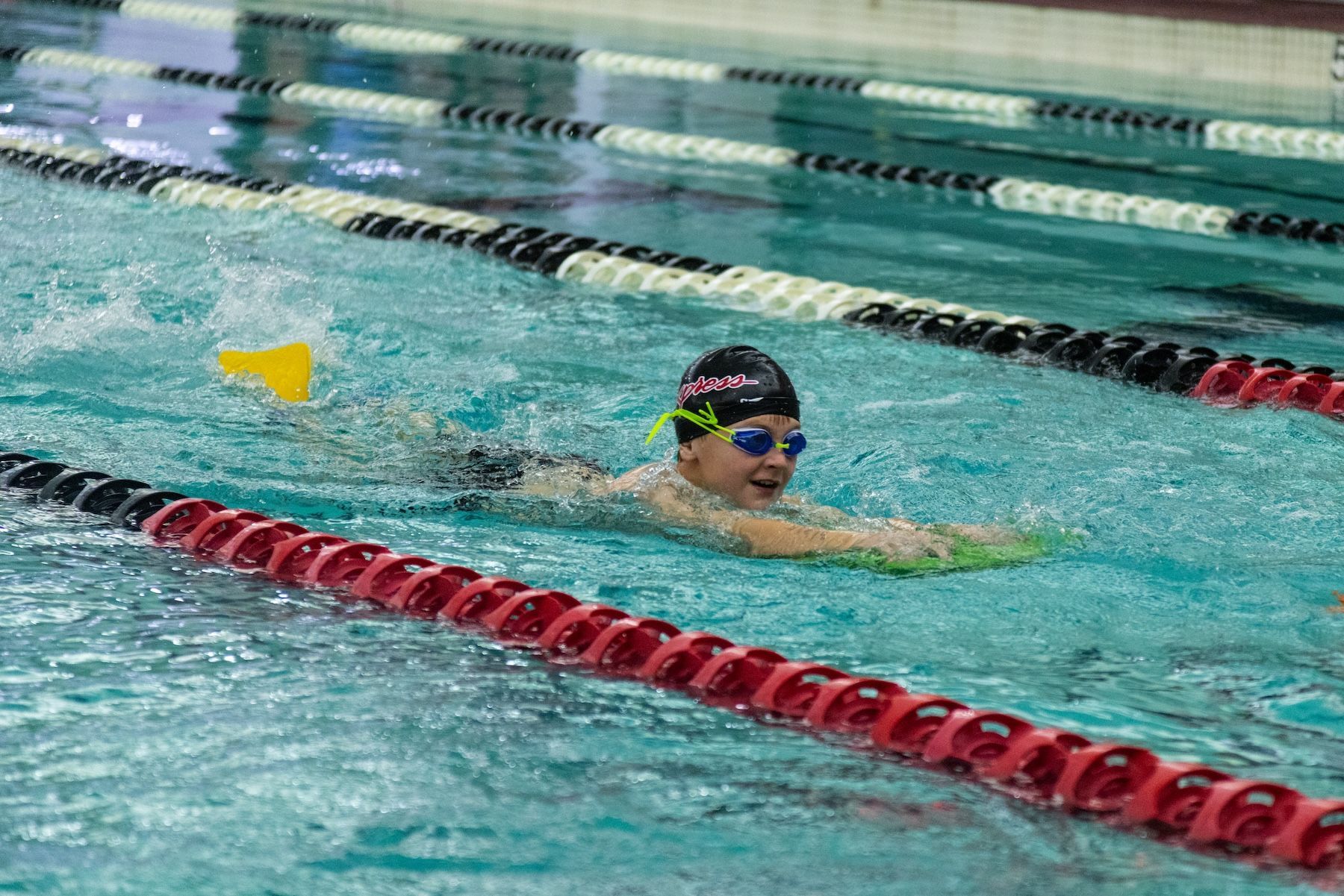 Practice equipment: Fins (short), Pull buoy, Snorkel, Kickboard.